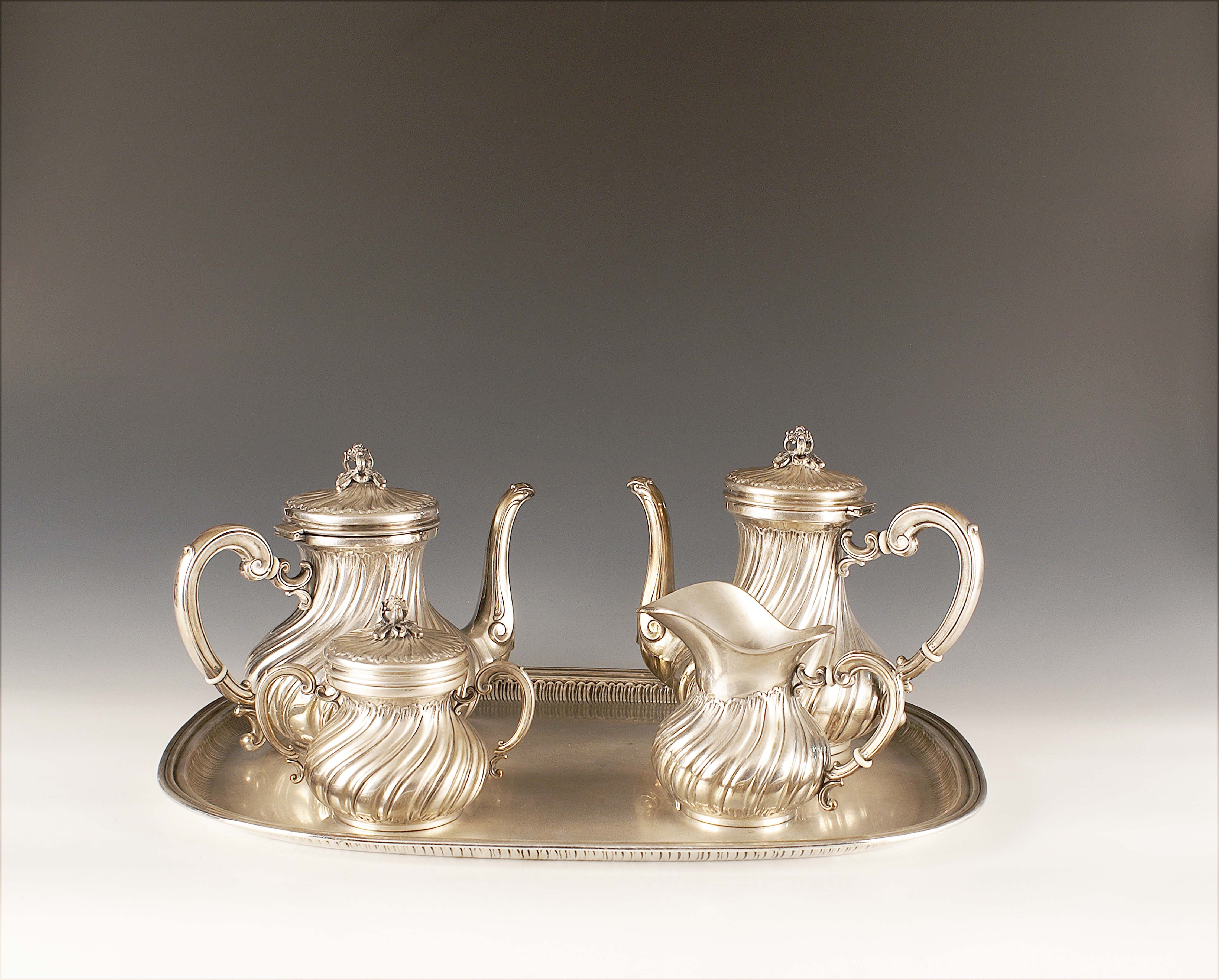 Servizio da the e caffè in argento composto da un vassoio, una teiera, una caffettiera, una lattiera e una zuccheriera, varie misure, gr. 4050.