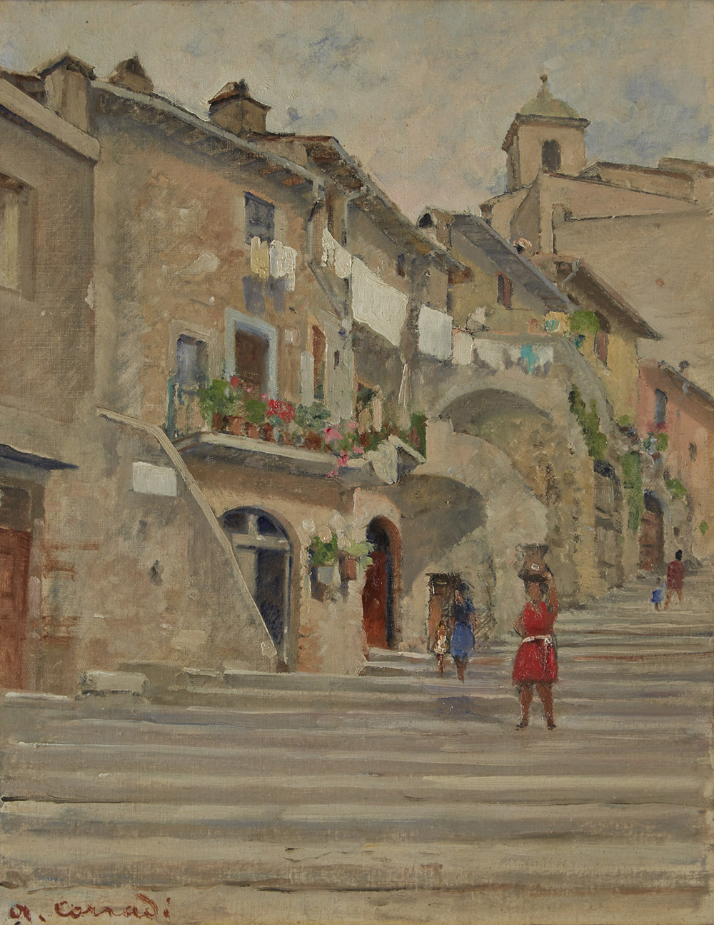 Alfonso Corradi (Castelnovo di Sotto 1889 - Milano 1972) "Palestrina" olio su cartone telato (cm 45x35) Firmato in basso a sinistra Al retro: firmato e titolato In cornice