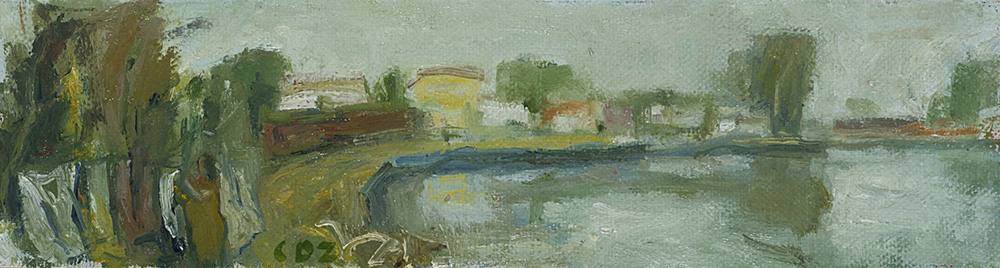 Carlo Dalla Zorza (Venezia 1903 - 1977) "Paesaggio" olio su tela (cm 6x21.5) Siglato in basso al centro In cornice