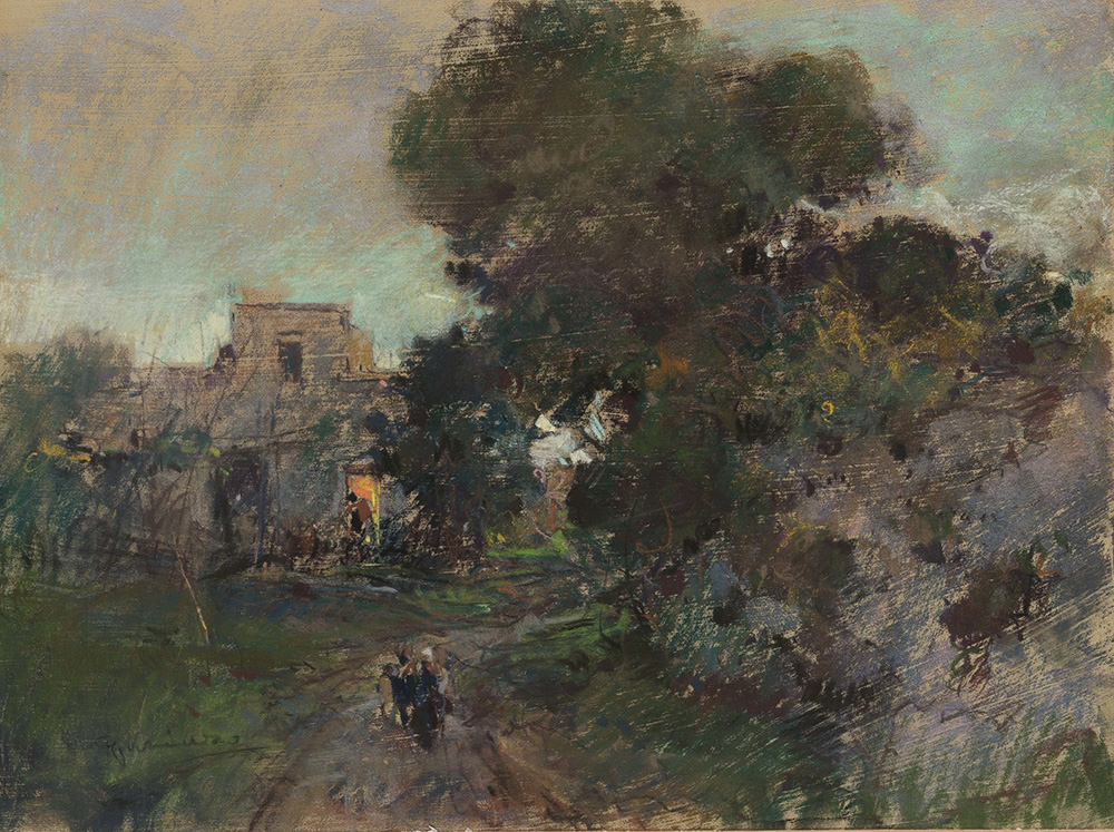 Giuseppe Casciaro (Ortelle 1861 - Napoli 1945) "Paesaggio" tecnica mista su carta (cm 29.5x40) Firmato in basso a sinistra. Al retro: timbro dell'artista In cornice (difetti)