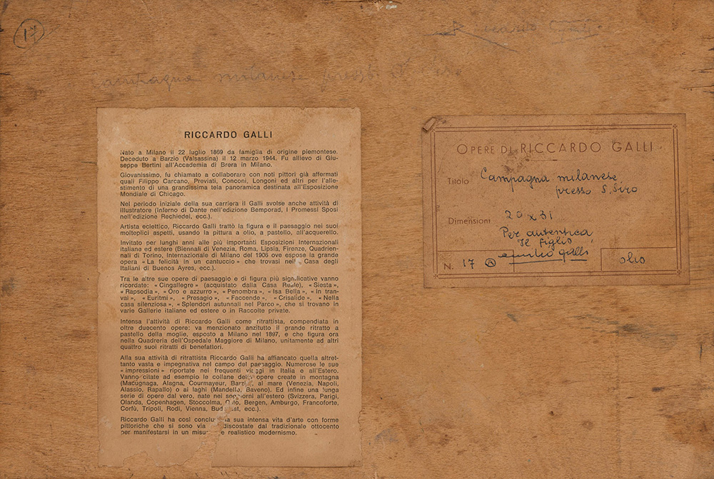 Riccardo Galli (Milano 1869 - Barzio 1944) "Campagna milanese presso San Siro" olio su compensato (cm 20.5x30.5) Firmato in basso a sinistra Al retro: titolato, e firmato; cartiglio Provenienza: Collezione Riccardo Galli. Cartiglio al retro firmato dal figlio Emilio Galli, n. 17A In cornice