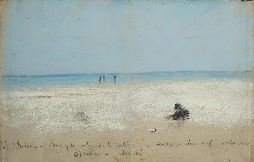 Francesco Paolo Michetti (Tocco da Casauria 1851 - Francavilla al Mare 1929) "Sulla spiaggia" pastelli colorati su carta (cm 30x47) In basso firmato ed iscrizione che così dichiara "S.Dalbono. Aggiungete molto con la fantasia e avrete un'idea del nostro mare Adriatico" In cornice