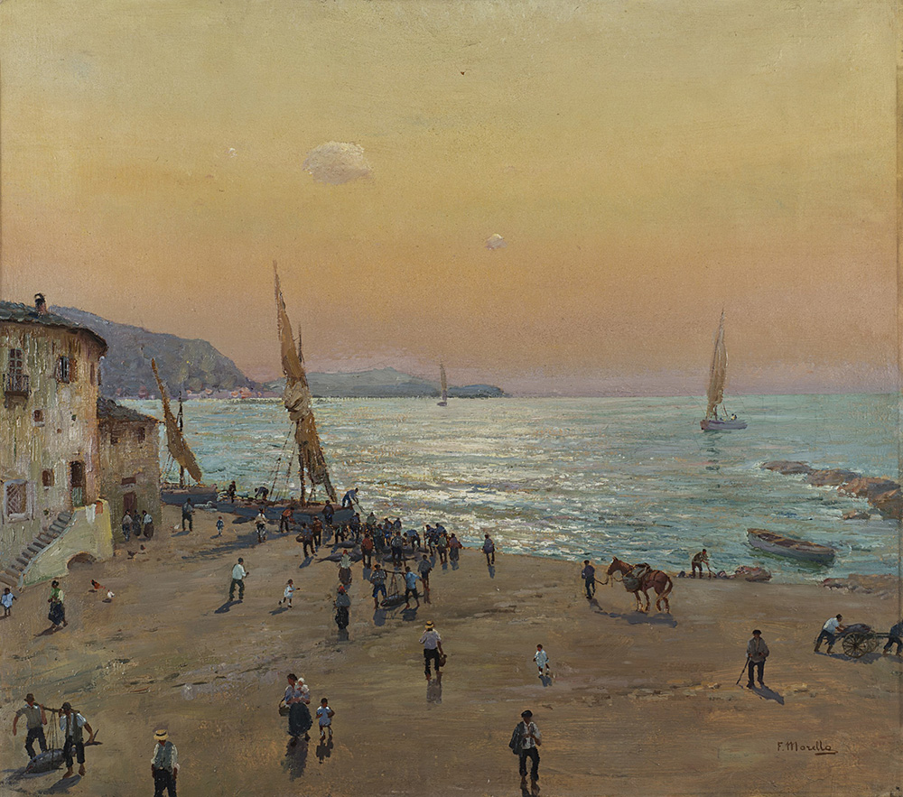 Federico Morello (Napoli 1885 - 1945) "Alba sul porto" olio su tela (cm 80x90) Firmato in basso a destra In cornice