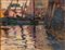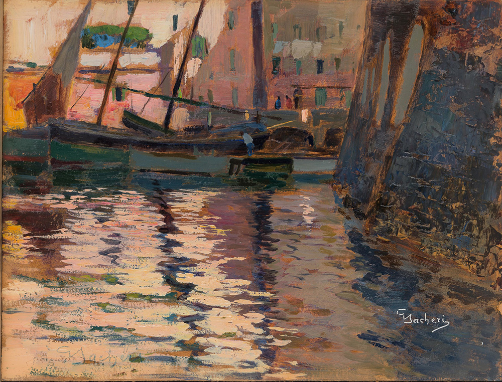 Giuseppe Sacheri (Genova 1863 - Pianfei 1950) "Mattino d'inverno a Frassineto Po'" e "Nel Porto di Camogli" due dipinti ad olio su cartone (cm 23x30) e (cm 23x34) Recano due firme non coeve in basso a destra e uno dei due firmato in basso a sinistra In cornici