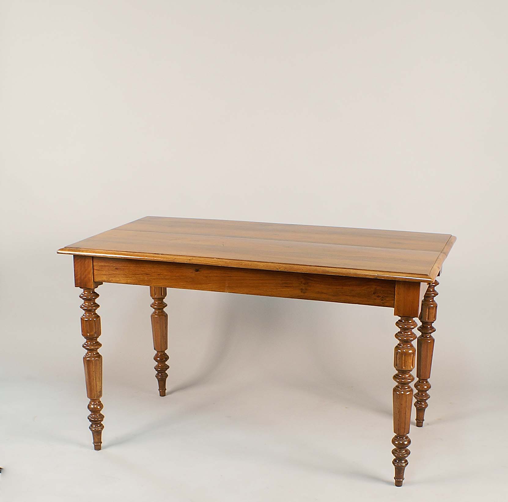 Tavolo allungabile in noce, piano rettangolare poggiante su quattro gambe a balaustro e tornite, Francia, fine XIX secolo, cm. 77x130x78, completo di due prolunghe da cm. 45 cadauna.
