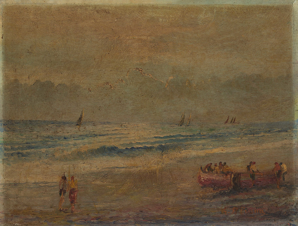 Artista IGNOTO recante firma G.F. PIANA "Marina con pescatori e vele sullo sfondo"