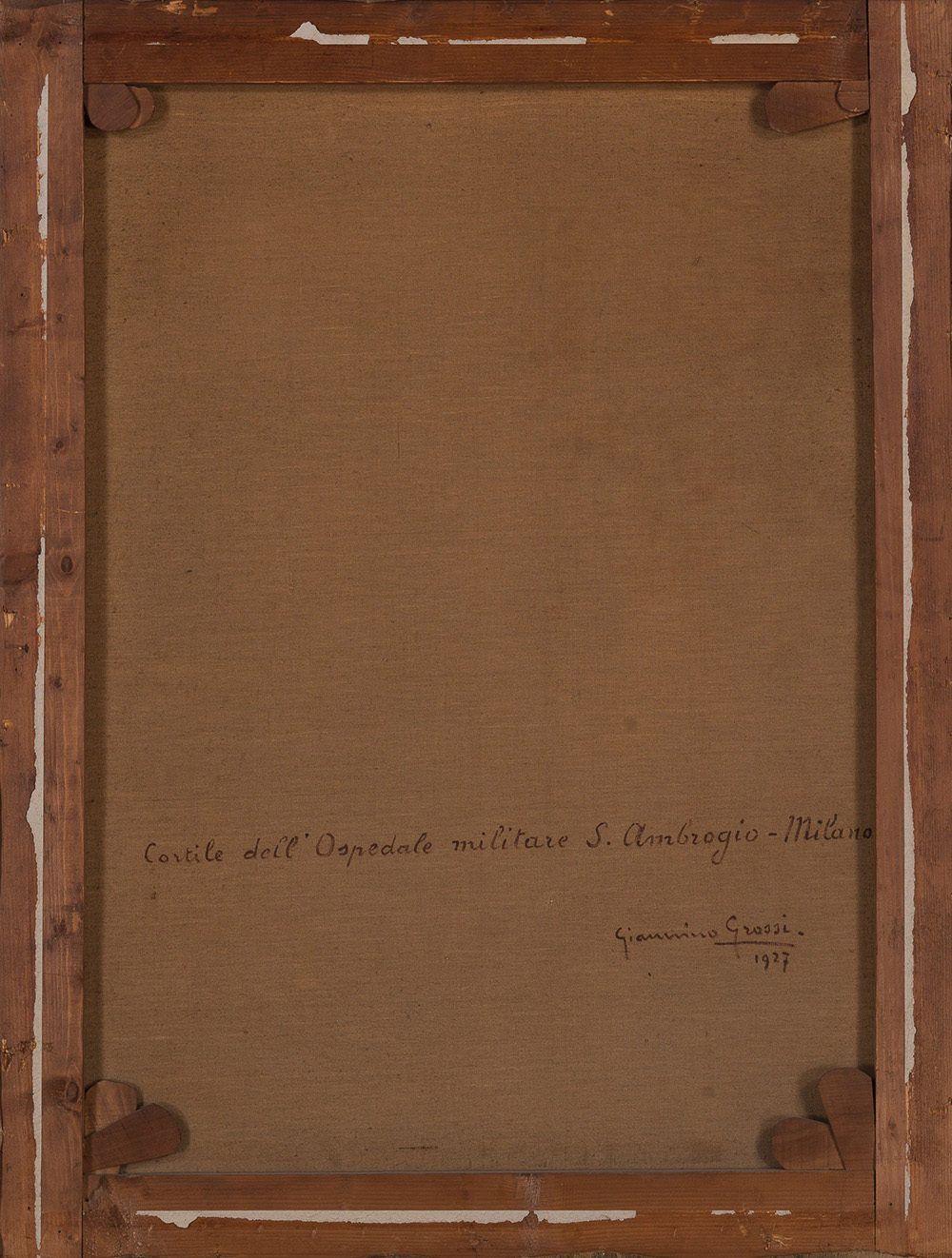 Giannino Grossi (Milano 1889 - 1969) "Cortile dell'Ospedale militare S.Ambrogio, Milano" 1927 olio su tela (cm 95x73) Firmato e datato in basso a destra Al retro: firmato, datato e titolato (difetti) In cornice