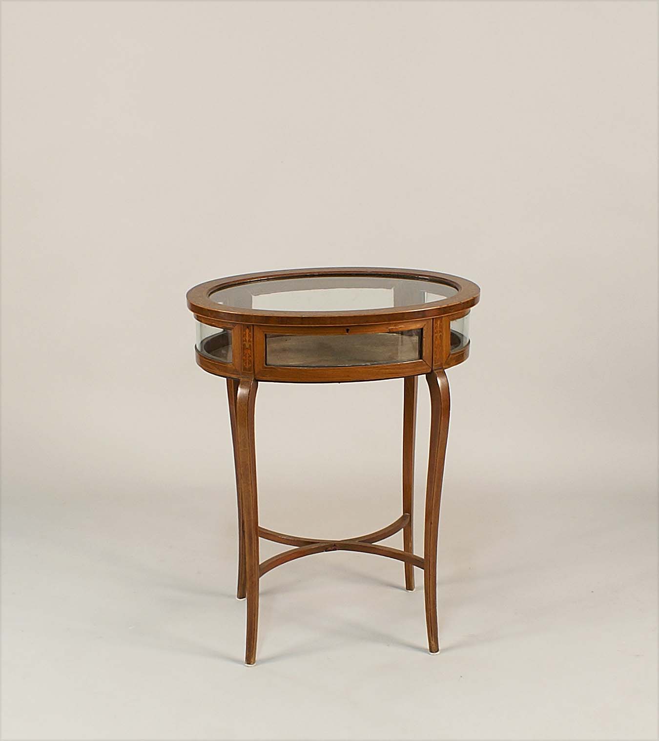 Tavolino bacheca in mogano intarsiato e filettato in bosso, piano ovale...