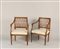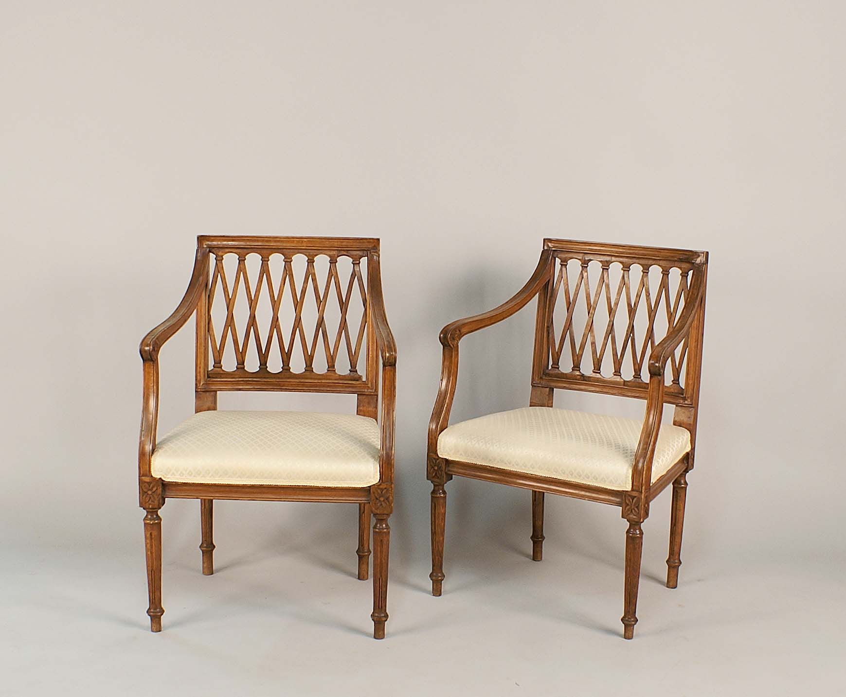 Cinque poltroncine in faggio, schienale traforato con seduta imbottita e rivestita in tessuto, vecchia manifattura, cm. 86x58x45.