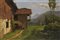 Ugo Gheduzzi (Crespellano 1853 - Torino 1925) "Scorcio con cascina e montagne sullo sfondo" olio su cartone (cm 38.5x58) Firmato in basso a destra In cornice