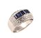 Anello a fascia in oro bianco 18kt con incastonati cinque zaffiri taglio baguette disposti a gradazione per carati 1,90 circa circondati da diamanti taglio brillante per carati 1,20 circa, gr. 11,1.