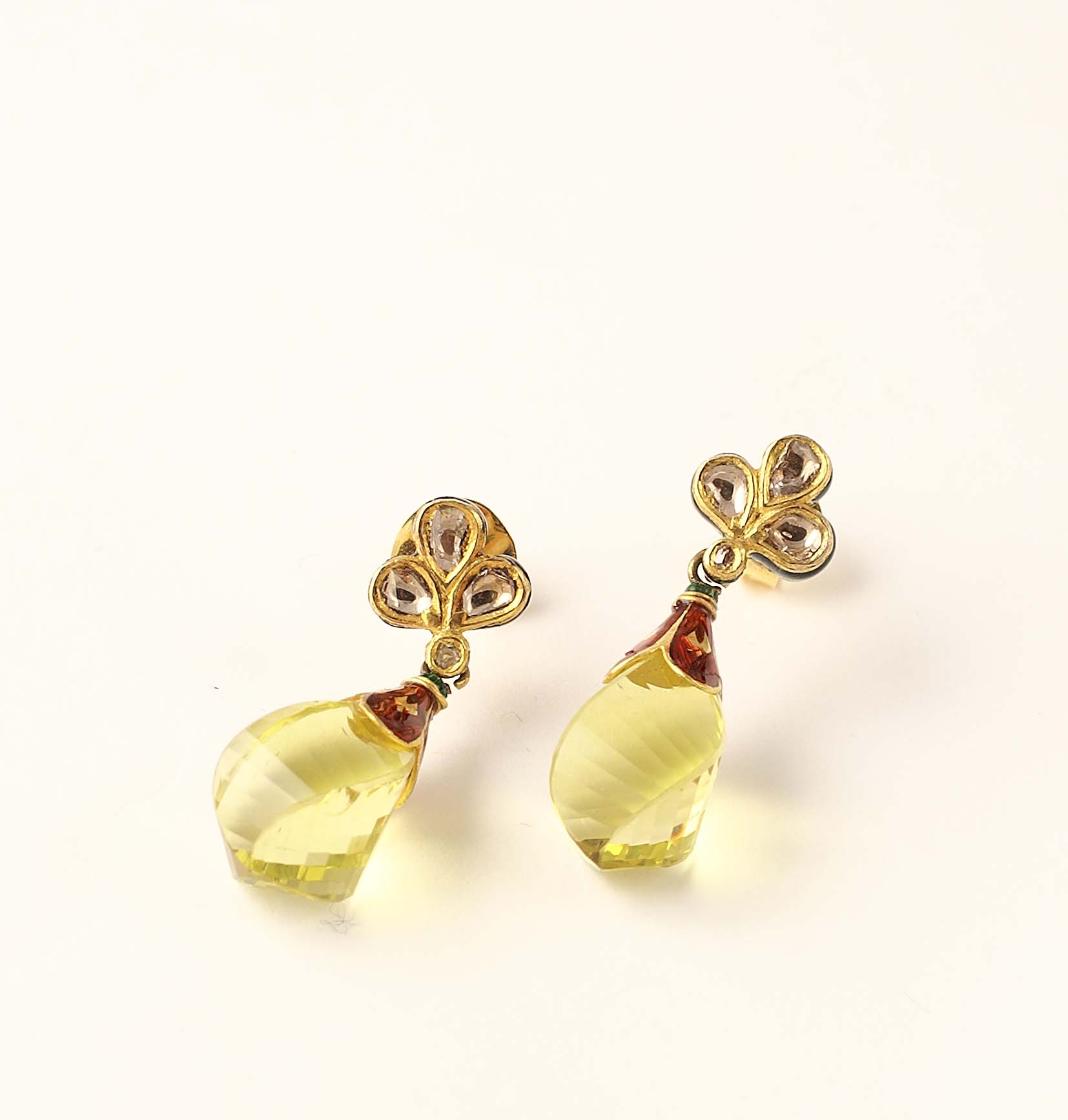 Orecchini pendenti in oro giallo 18kt e smalto policromo con incastonati otto rose di diamanti e due quarzi lemon taglio briolet, gr. 12,6.