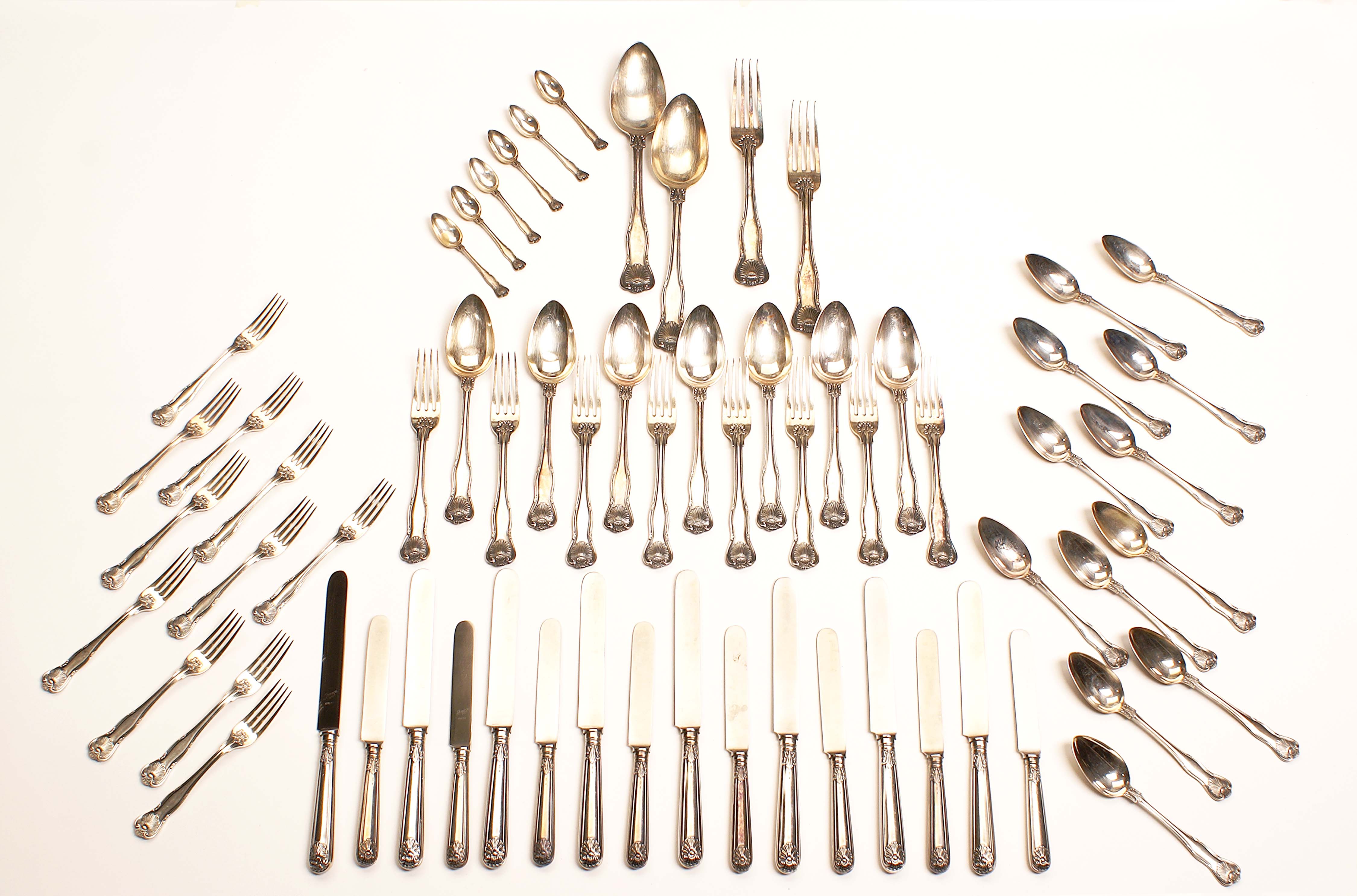 Servizio di posate in argento con manici finemente cesellati a motivo di conchiglia, firmato Broggi, anni 40/50, composto da 24 forchette, 24 coltelli, 12 cucchiai, 12 cucchiai medi, 24 forchette da dessert, 24 coltelli da dessert, 12 cucchiaini e 4 posate da portate, gr. 8.200 circa.