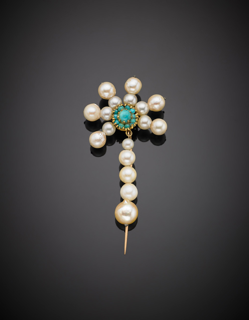 Spillone in oro giallo con perle degradanti verso il centro e turchesi...