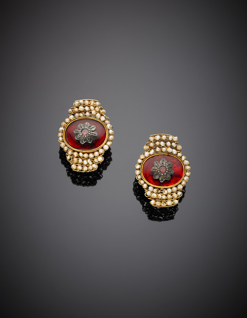 Orecchini a lobo in oro giallo, argento, pasta vitrea rossa e microperle, g.8,10 Yellow gold, silver, pearl, vitreous paste earrings, g.8,10