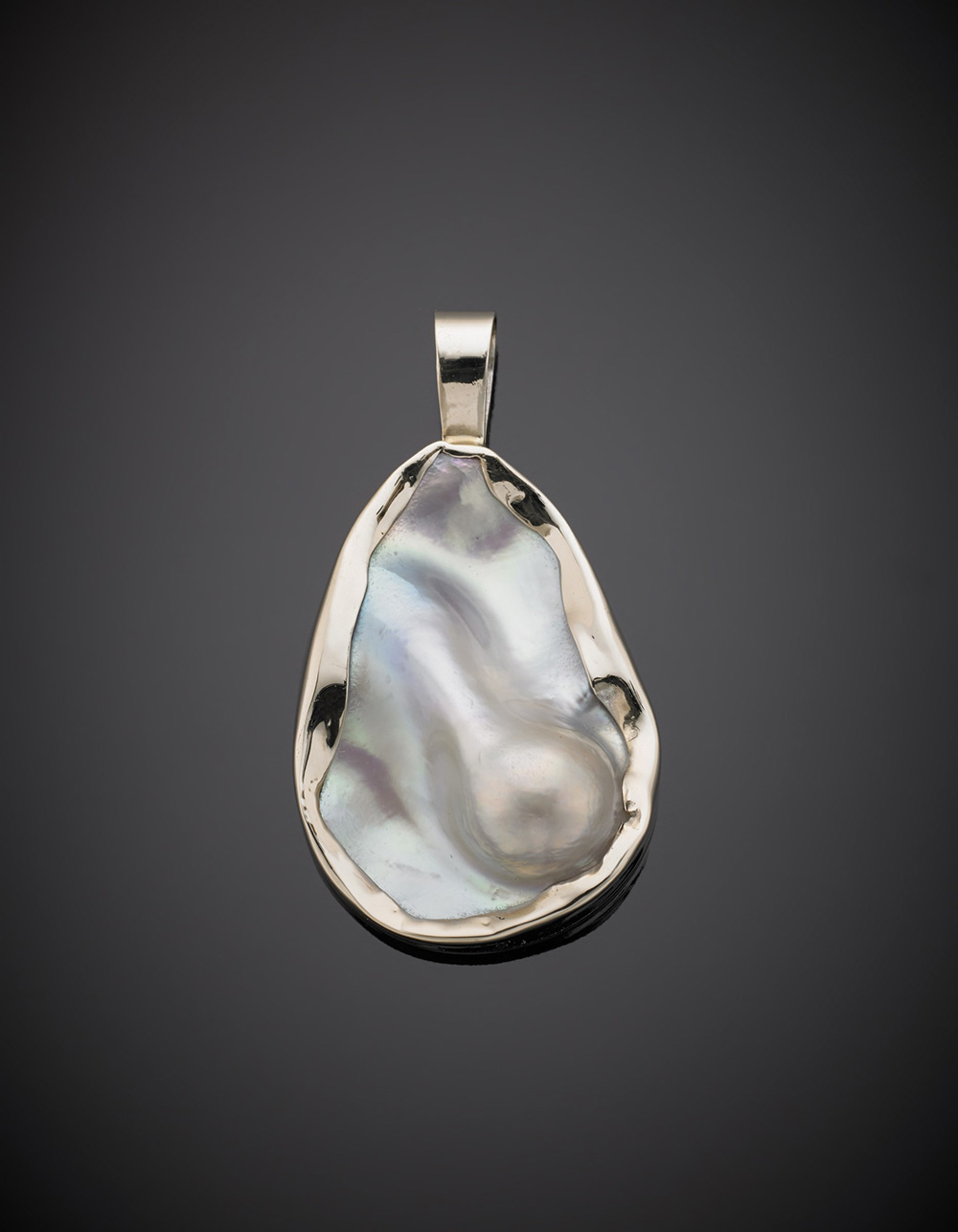 Pendente in oro bianco a rilegare una madreperla grigia con mezza perla, g. 14,70 White gold mother-of-pearl and half pearl pendant, g. 14,70