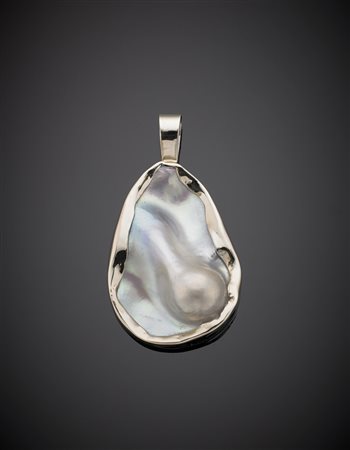 Pendente in oro bianco a rilegare una madreperla grigia con mezza perla, g....