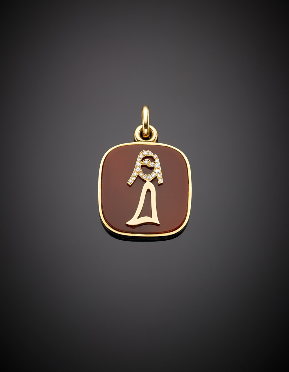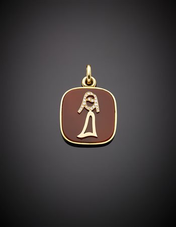 Pendente in oro giallo, corniola e diamanti con figura stilizzata, g.13,70 lungh. cm 4,6 Yellow gold diamond accented carnelian pendant, g.13,70 length cm 4,6