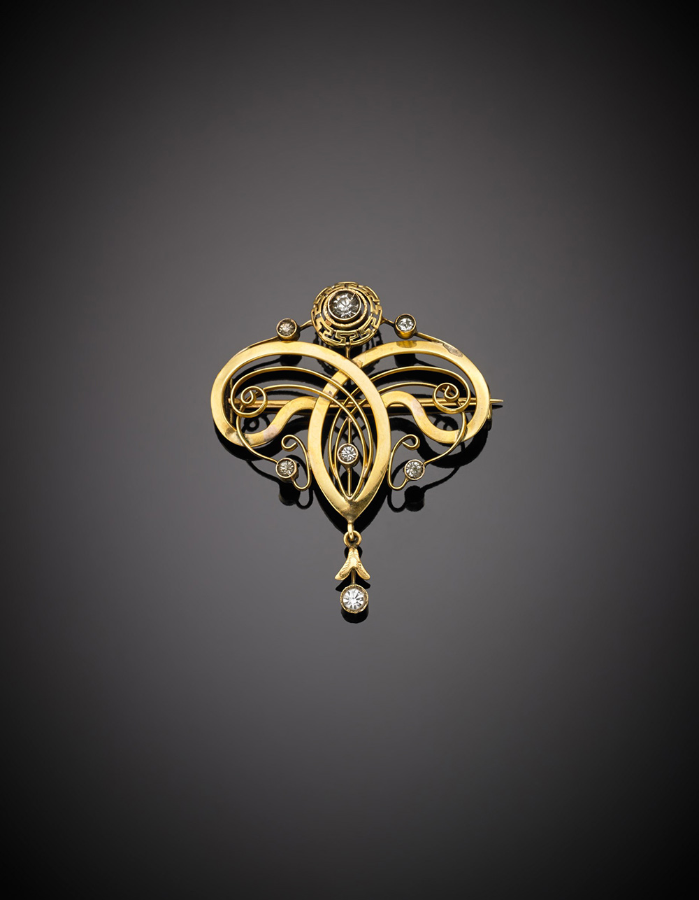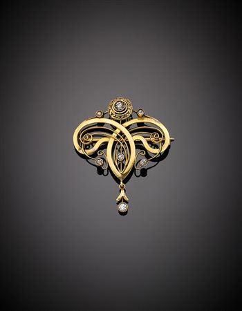 Spilla in oro giallo a volute con paste vitree, g.5,80, largh. cm 3,9 circa Yellow gold vitreous paste volute brooch, g.5,80 width cm 3,9 circa