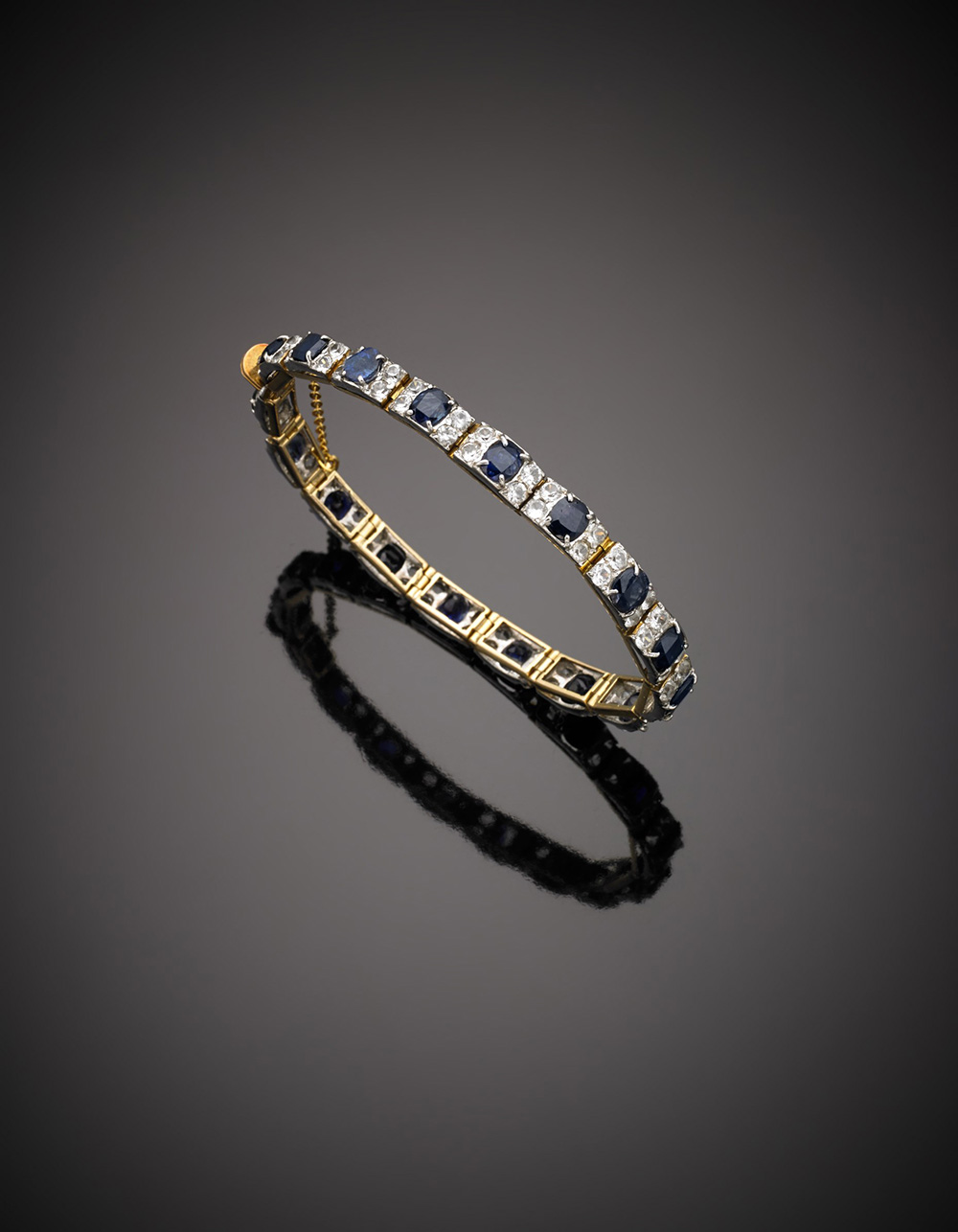 Bracciale in oro 333/1000 e quarzi incolori, zaffiri e paste vitree, g.16,50 lungh. cm 18 circa Yellow 9K gold hyaline quartz, sapphire and vitreous paste articulated bracelet, g.16,50 length cm 18 circa