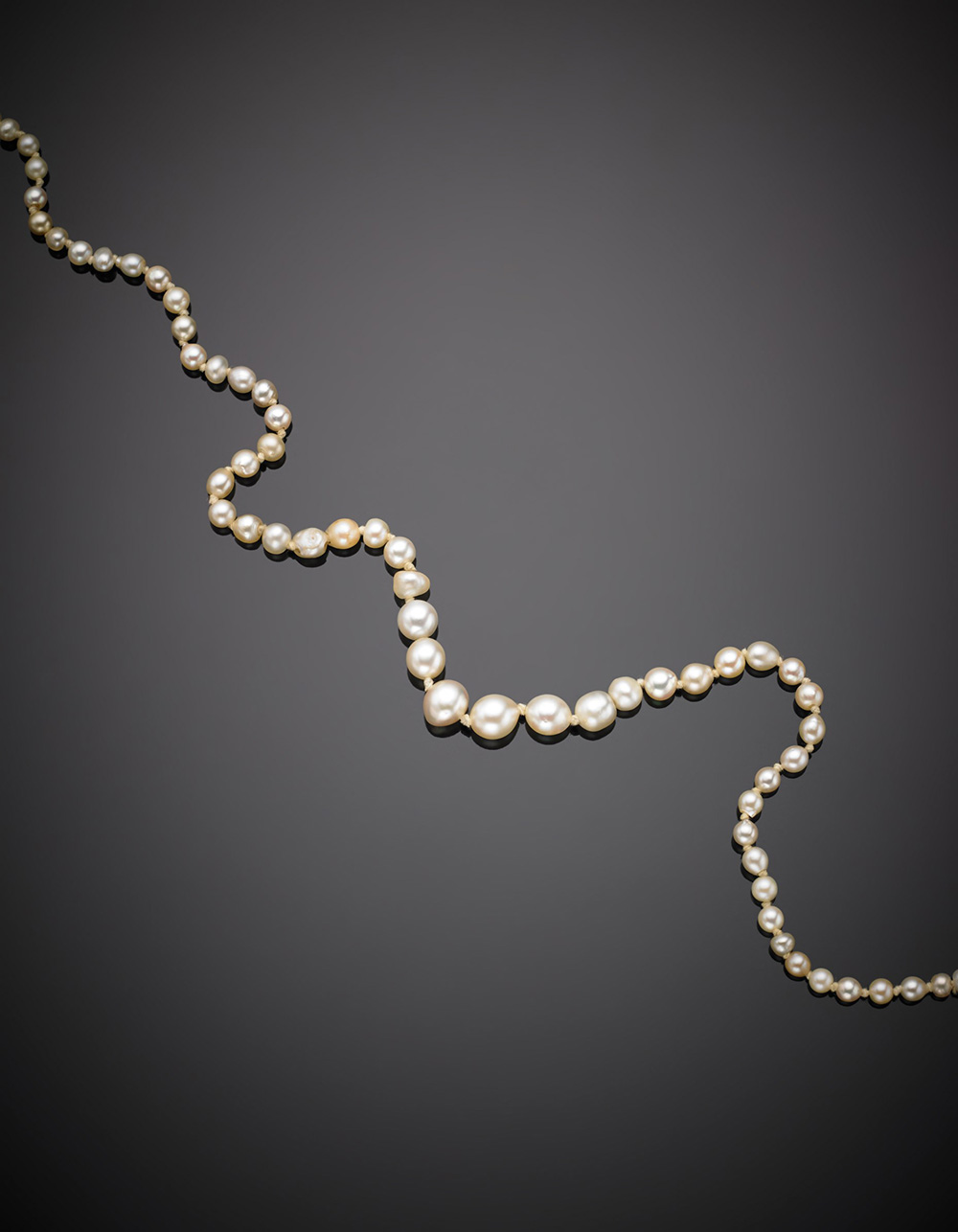 Collana di perle bianche, il 25% circa naturali di acqua salata, a scalare da mm 3,05 a mm 6,80, g.8,30, lungh. cm 45 circa White graduated pearl necklaceof which 25% natural salt water, pearl from mm 3,05 to mm 6,80, g.8,30, length cm 45 circa