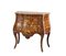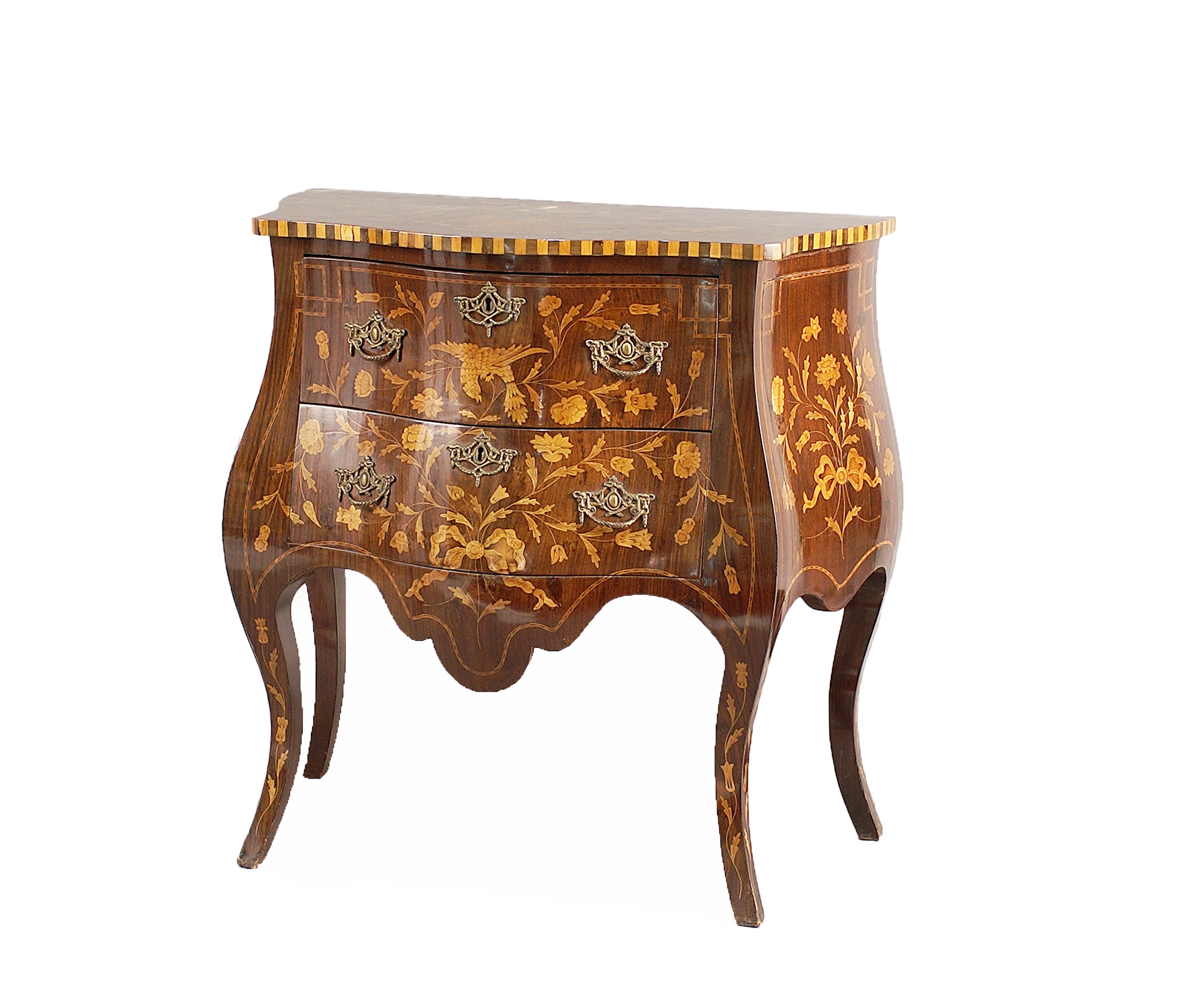 Comode di linea mossa in palissandro intarsiata in legni di frutto a motivo floreale, piano sagomato con due cassetti sottostanti e relative maniglie e bocchette in bronzo, vecchia manifattura, cm. 79x76x45.