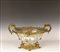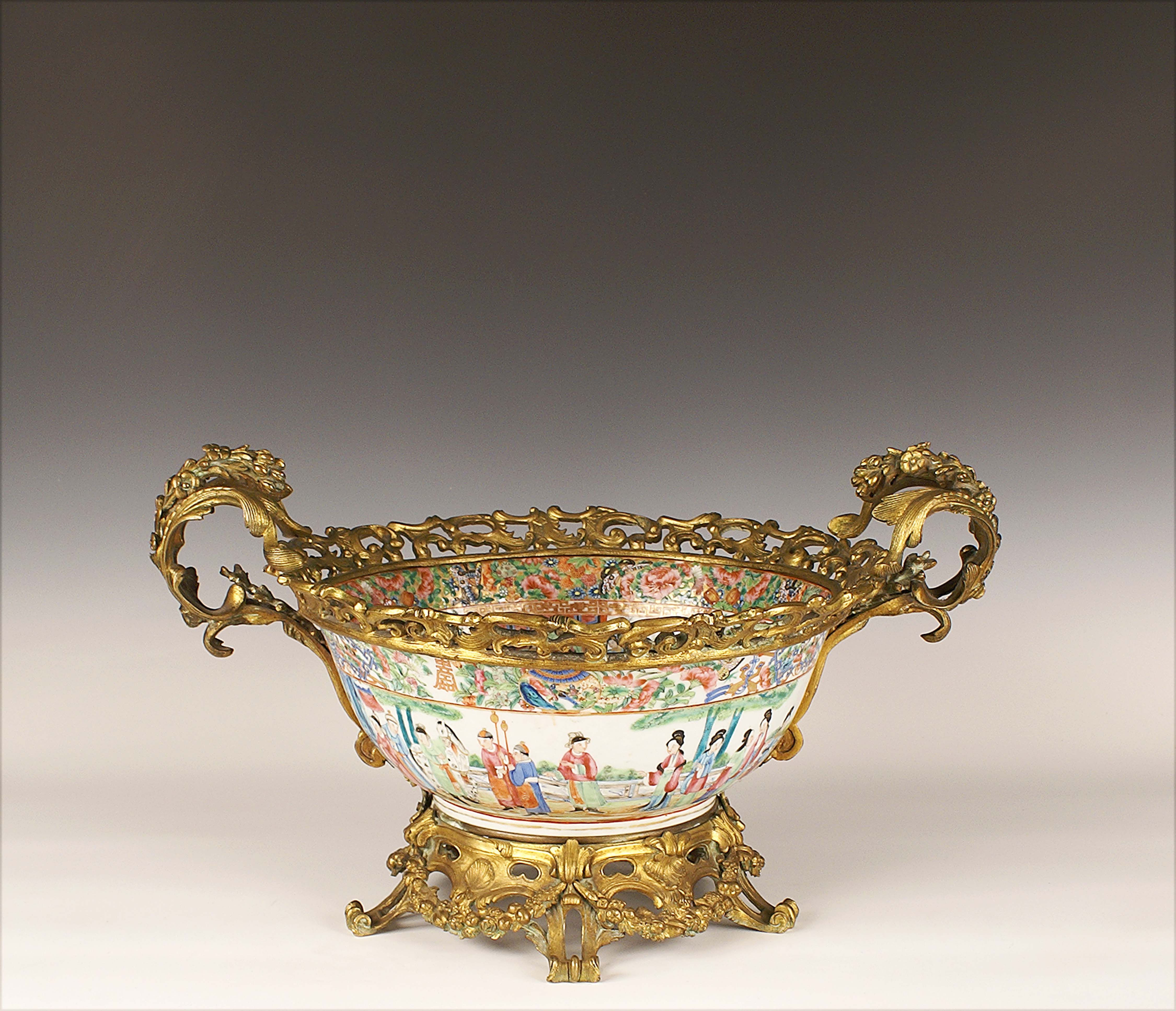 Centrotavola in porcellana dipinta in policromia e decorato a motivo di scene orientali entro struttura in bronzo dorato e cesellato, decorato a motivi floreali, Francia, fine del XIX secolo, cm. 28x55x40.