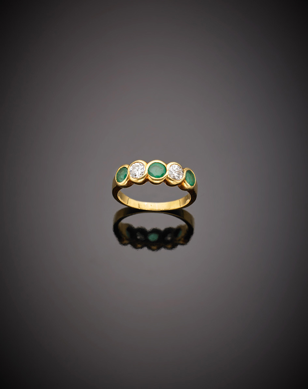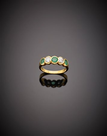 Fedina in oro giallo con tre smeraldi e due diamanti, g.4,10, misura 12/52 Yellow gold diamond and emerald ring, g.4,10 size 12/52