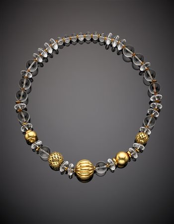 Collana in boules e rondelle in quarzo ialino con distanziatori e chiusura in oro giallo, g.77,90 lungh. cm 44,50 Hyaline quartz bead necklace with yellow gold spacers and clasp, g.77,90 length cm 44,50