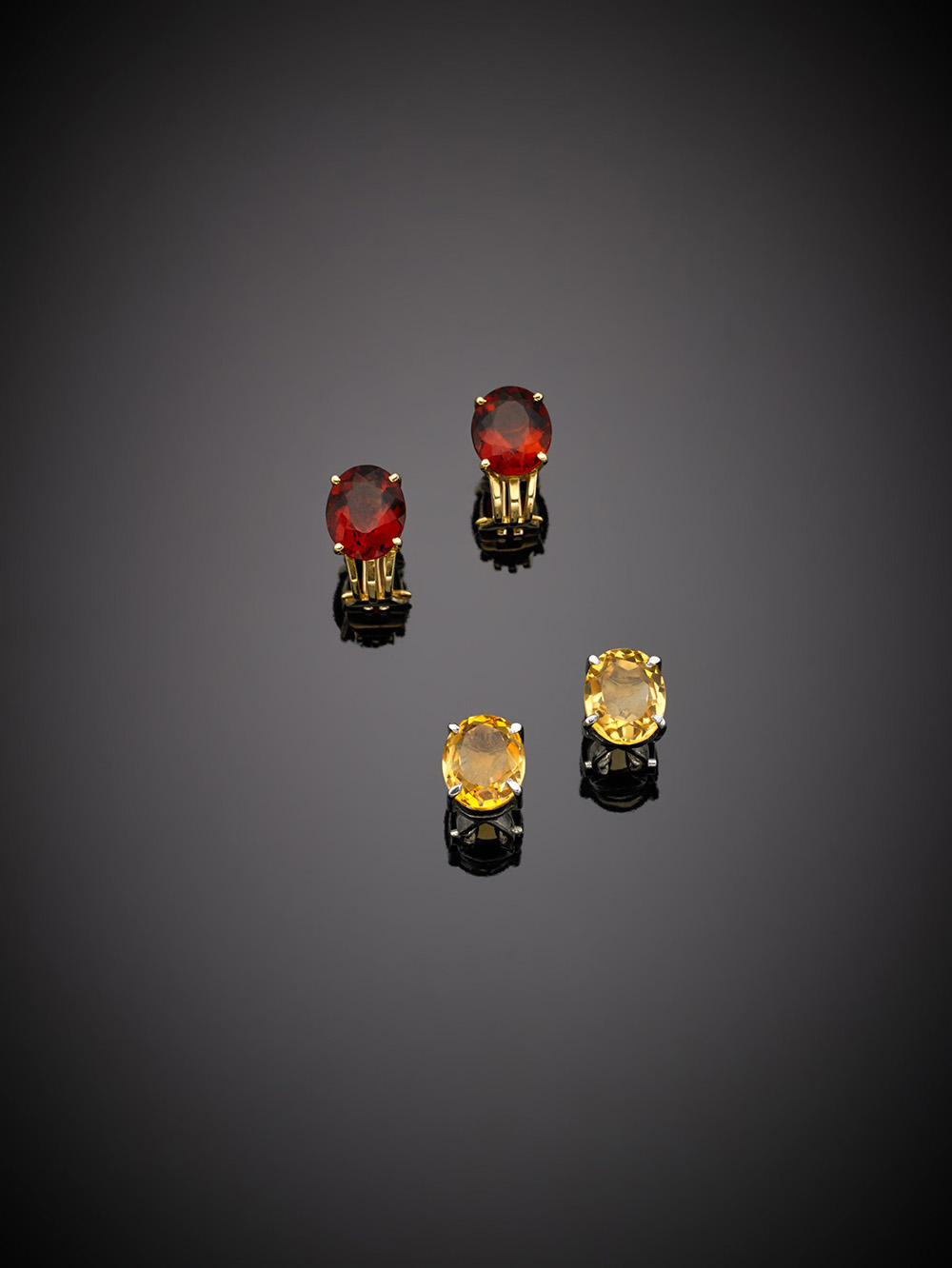 Due paia di orecchini in oro giallo con clip e quarzi citrini, complessivi g.10,90 Two pairs of yellow gold citrine quartz earrings, in all g.10,90