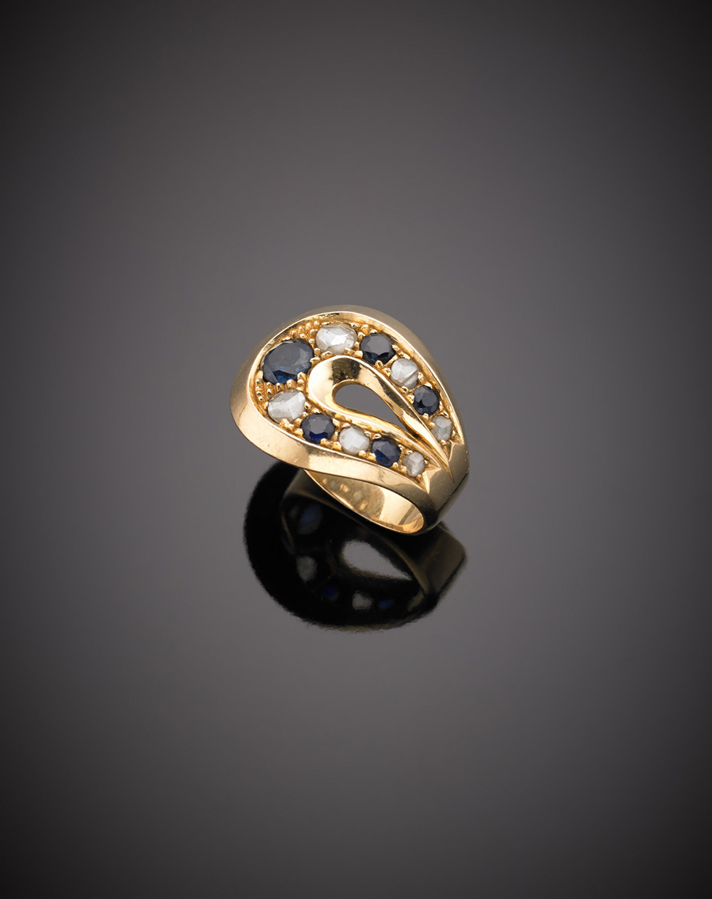 Anello in oro giallo a ricordare un ferro di cavallo con diamanti e zaffiri, g. 11,90, misura 11/51 Yellow gold diamond sapphire horse-shoe ring, g.11,90 size 11/51