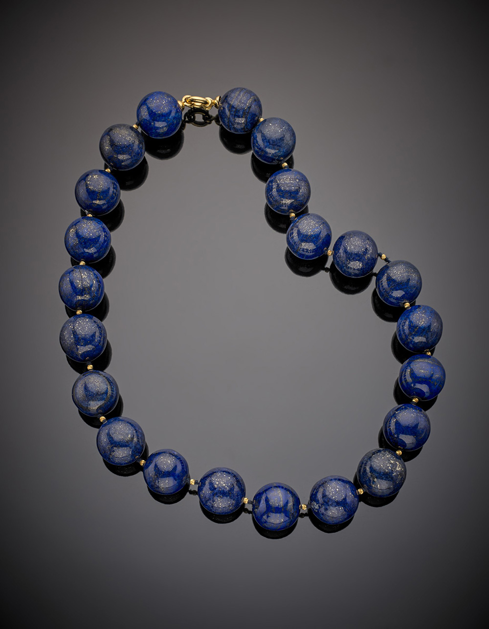 Collana in lapislazzuli con boules di mm 20,50 circa, con chiusura e distanziatori in oro giallo, g. 311,40 Lapis bead necklace with yellow gold spacers and clasp, lapis bead diam mm 20,50, g. 311,40