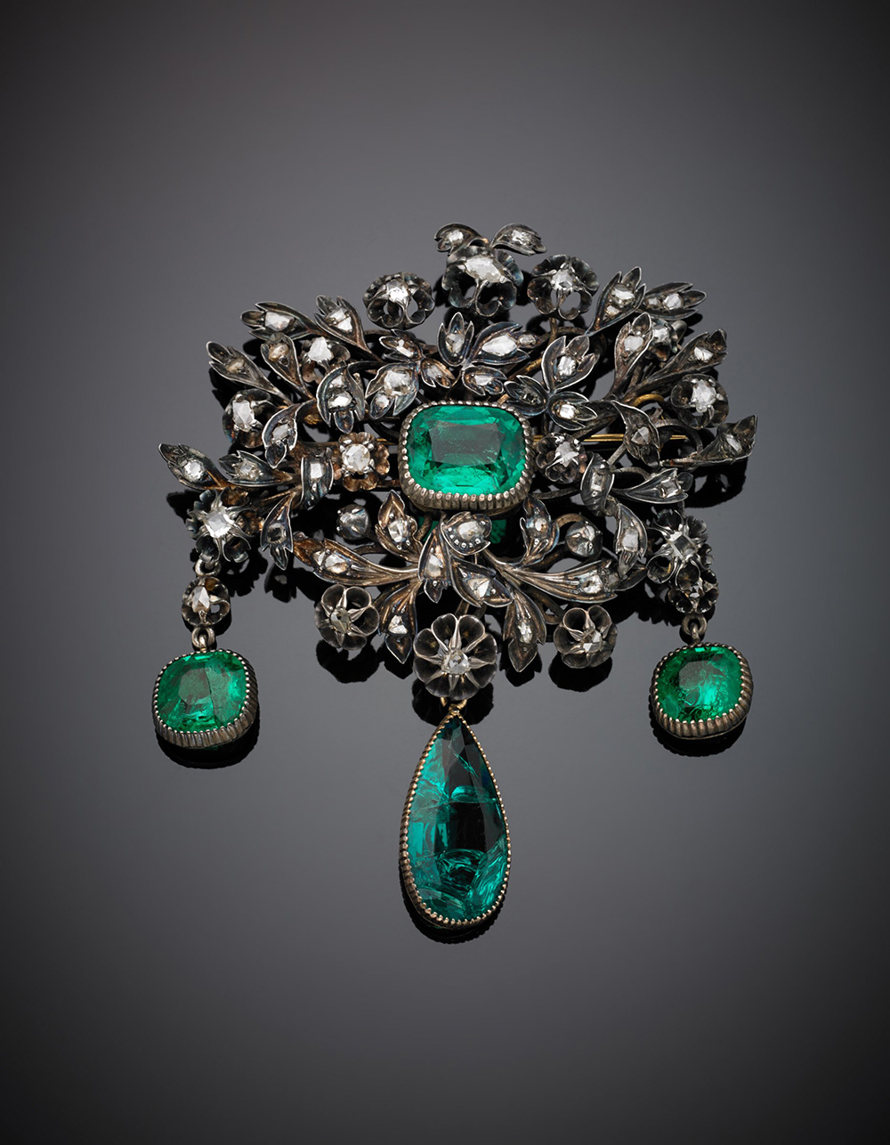 Broche in argento con diamanti irregolari a mezza rosetta e paste vitree verdi, spillone in oro giallo, g.51,20 lungh. cm 9 largh. cm 7,50 circa Silver irregular diamond green vitreous paste brooch with yellow gold pin, g.51,20 length cm 9 width cm 7,50 circa