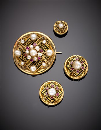 Yellow gold set comprising a round brooch, two smaller lapel brooches and a button with rubies, pearls and black enamel, in all g.35, 20