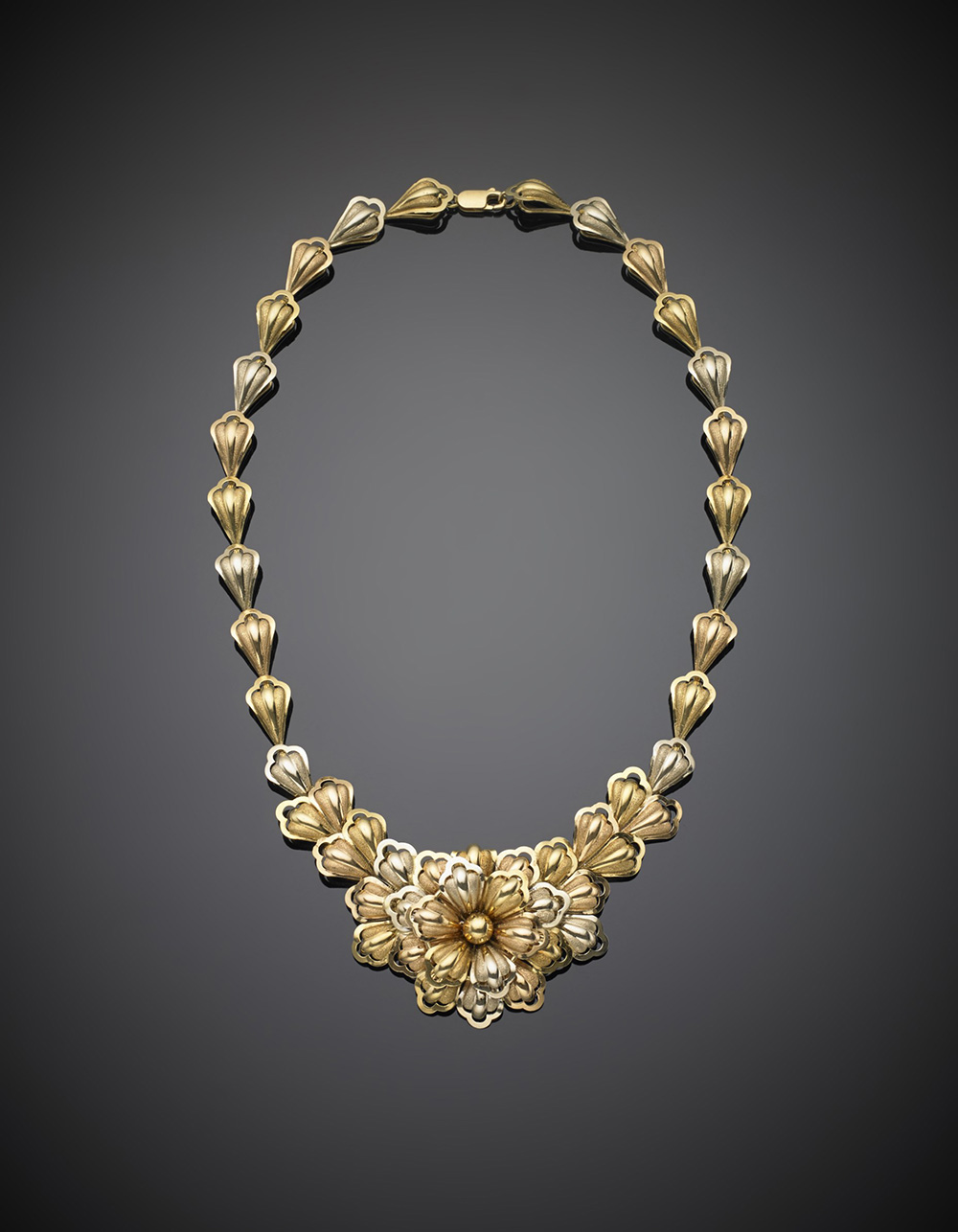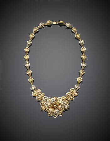 Collana in oro giallo, bianco e rosso con centrale floreale, g. 38,50, lungh. cm 40 circa. Punzonato V e 10 MO Tri-coloured gold floral necklace g. 38,50 length cm 40,0, marked V and 10 MO