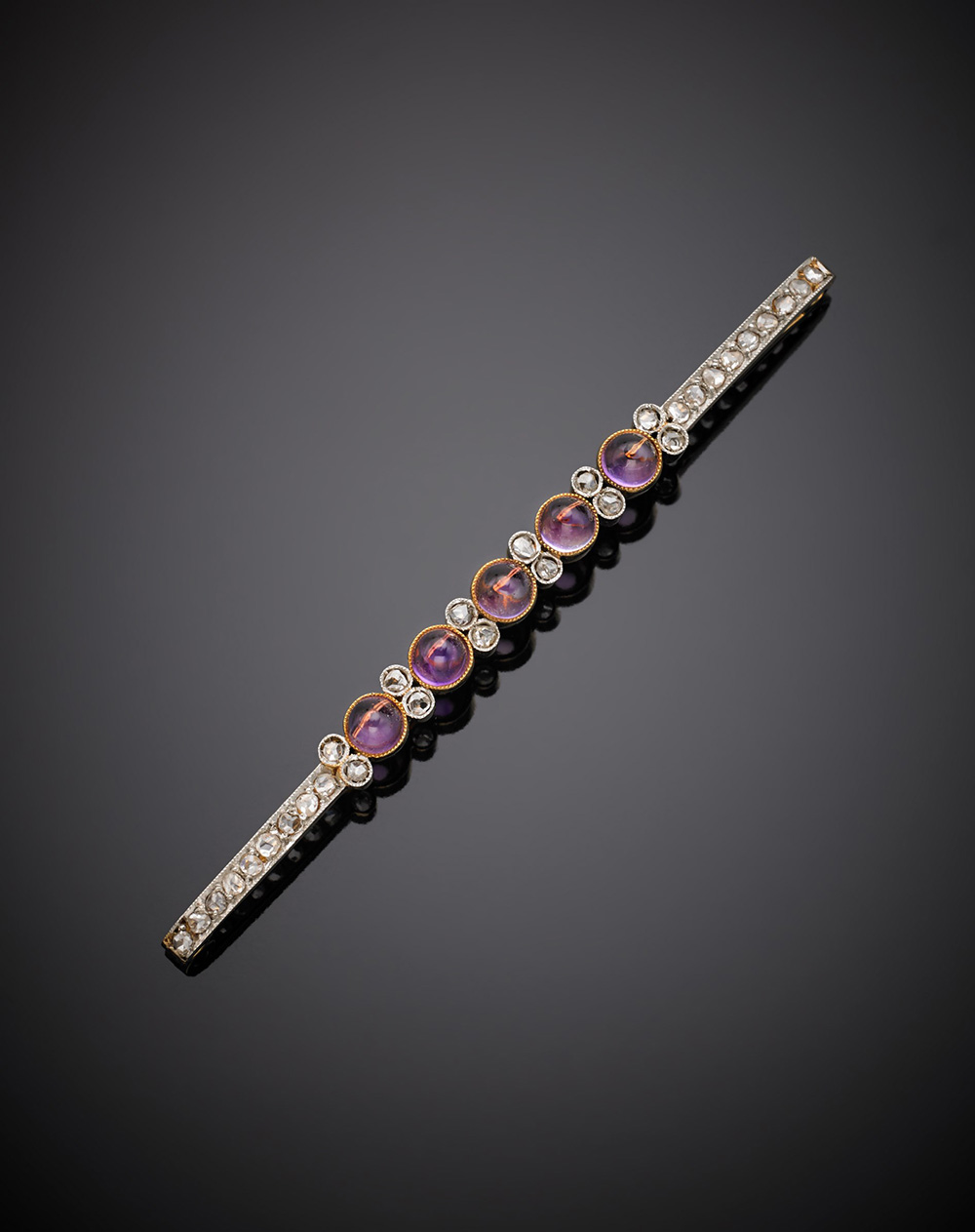 Spilla a barretta in oro giallo e bianco con diamanti e ametiste cabochon, g....