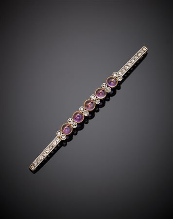 Spilla a barretta in oro giallo e bianco con diamanti e ametiste cabochon, g. 10,20, lungh. cm 8,50 circa Yellow gold silver diamond and cabochon ametyhyst bar brooch, g.10,20 length cm 8,5 circa