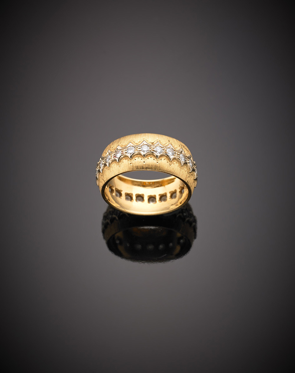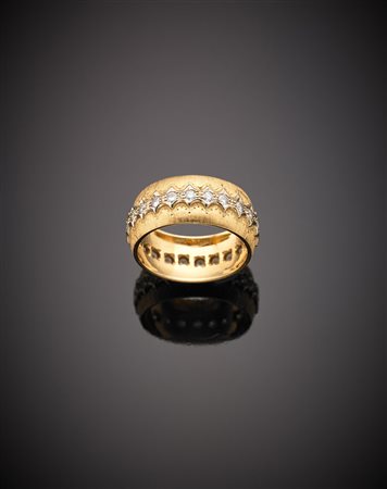 Anello a fascia in oro giallo lucido e satinato con diamanti modello eternity montati in oro bianco, g. 7,70, misura 17-18/57-58 Bi-coloured gold band ring partially glazed with diamonds all around, g.7,70 size 17-18/57-58