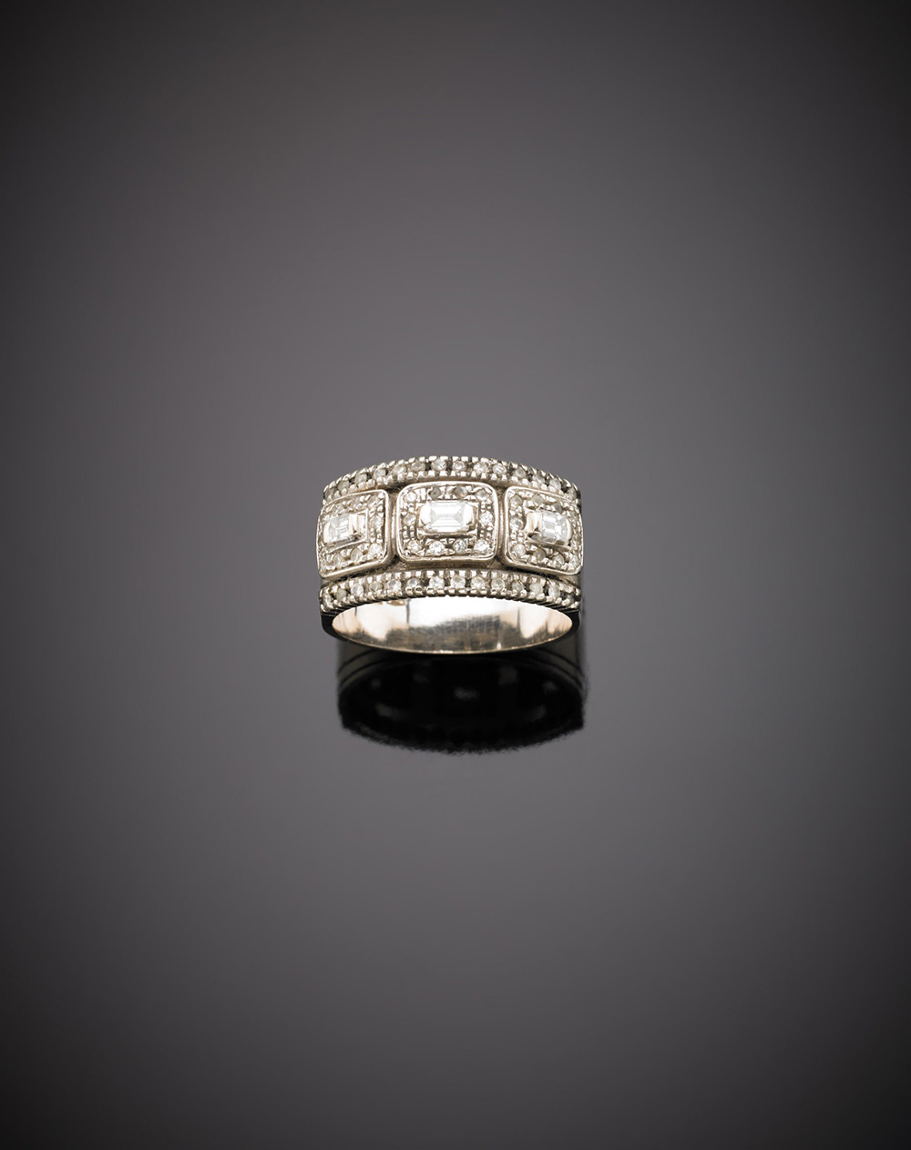 Anello a fascia in oro bianco con diamanti rotondi e a baguette, g.8,10 misura 19/59 White gold round and baguette diamond band ring, g.8,10 size 19/59