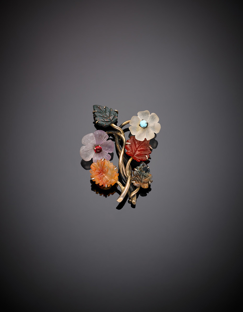 Spilla in oro giallo 333/1000 con parti floreali in pietre dure, g.9,80...