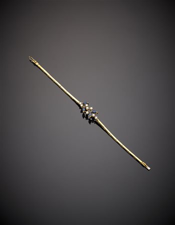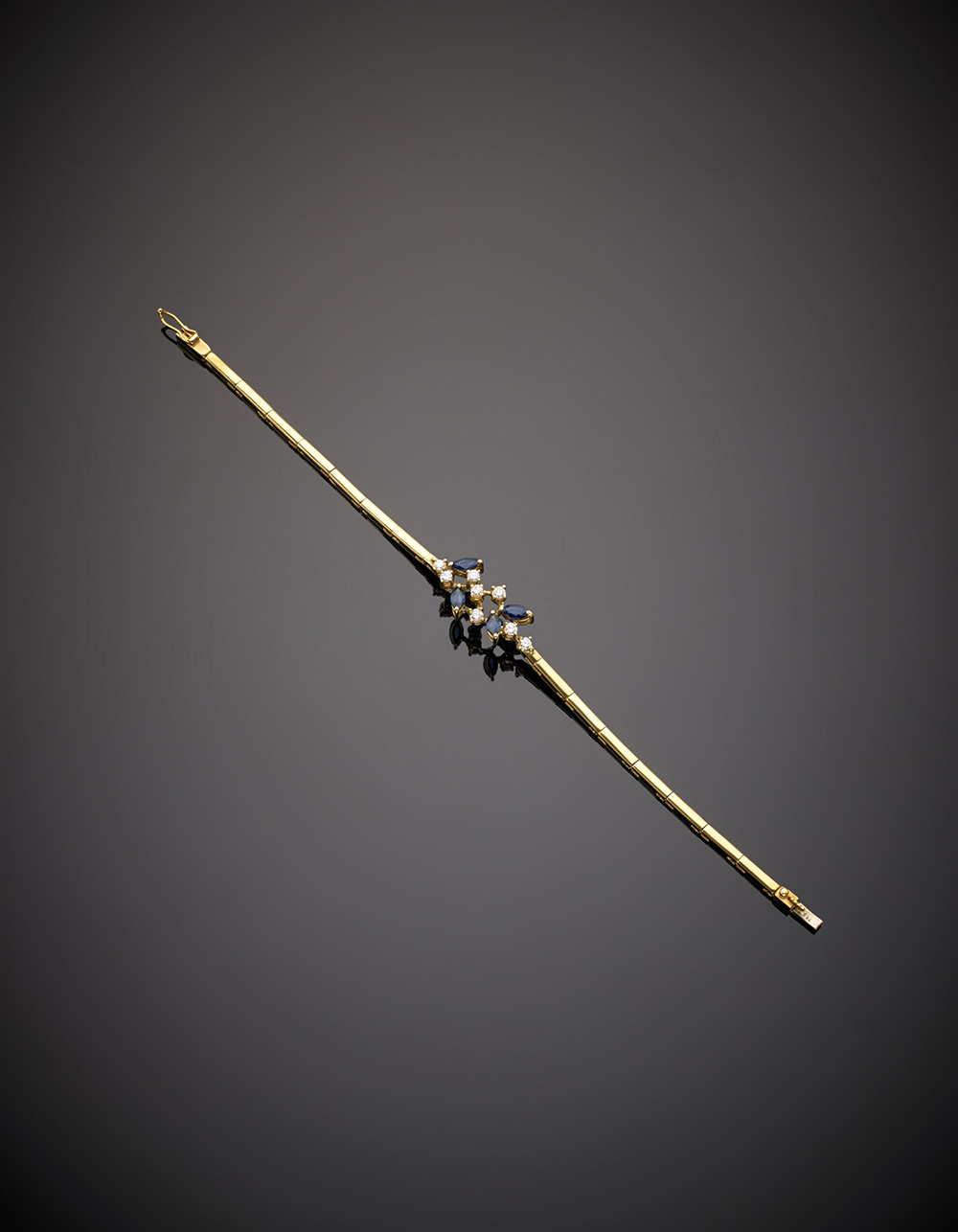 Bracciale semirigido in oro giallo con al centro diamanti rotondi e zaffiri a navette g.11,00 lungh. cm 17,8 circa Yellow gold round diamond and marquise cut sapphire segmented bracelet, g.11,00 length cm 17,8 circa