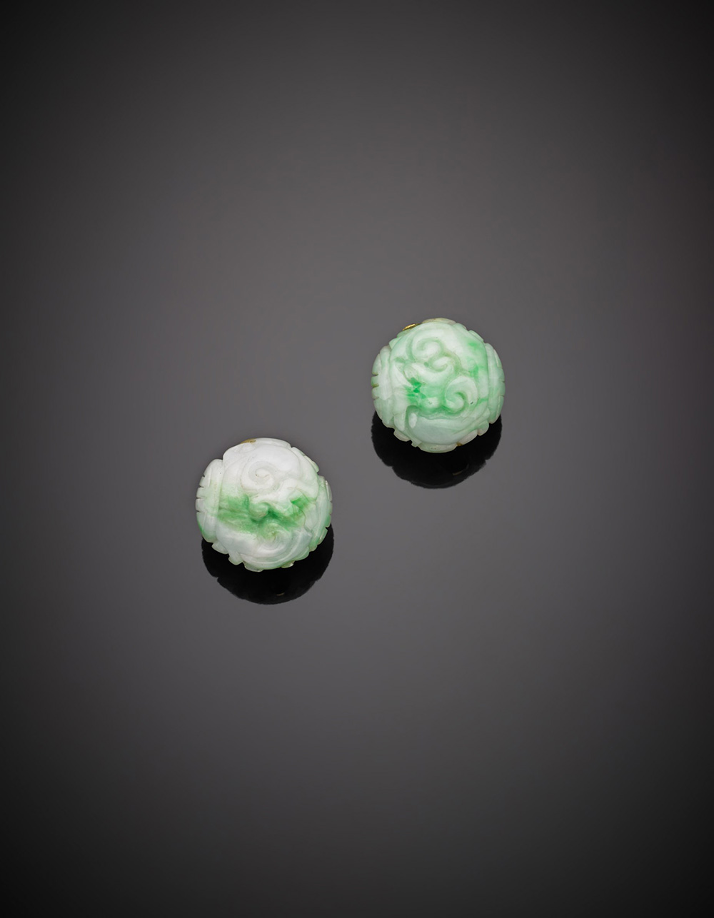 Orecchini a lobo con clip in oro giallo e mezze sfere in giadaite scolpita, g.18,40 diam. cm 2,1 Yellow gold carved jadeite half sphere earclips, g.18,40 diam. cm 2,1