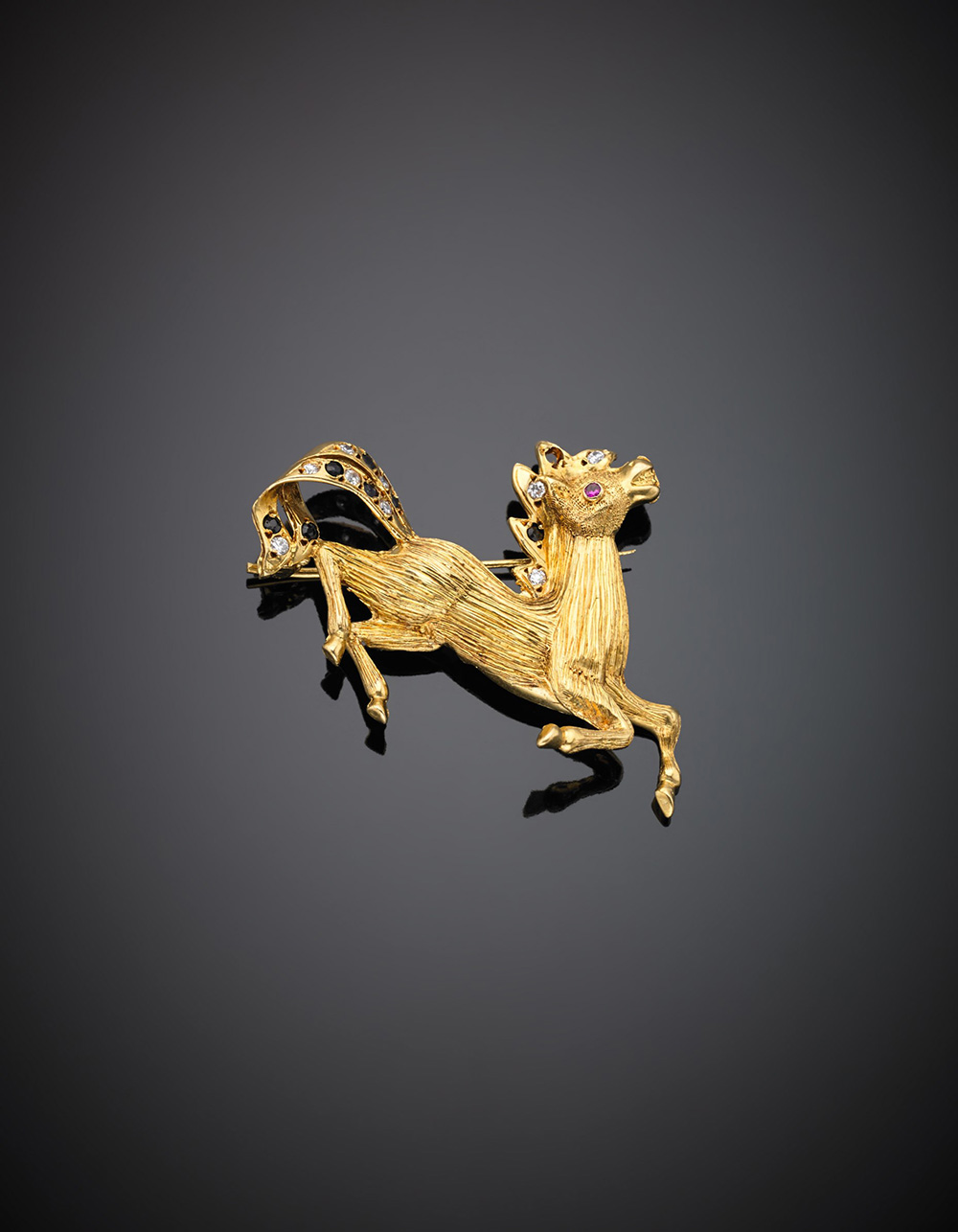 Spilla in oro giallo zigrinato a guisa di cavallo con gemme incolori e pietre...
