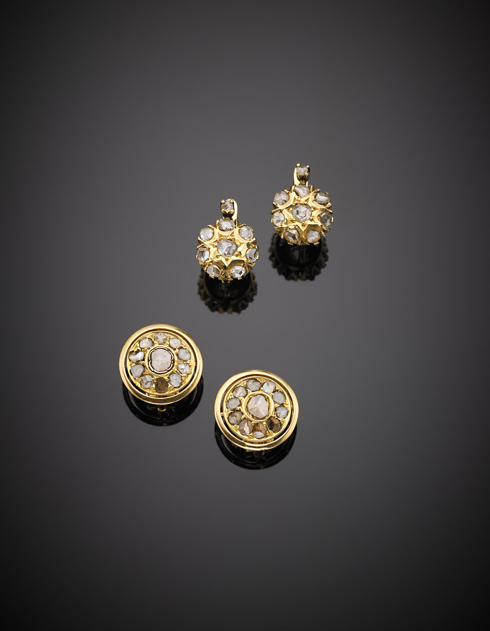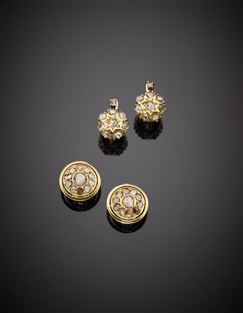Lotto di due paia di orecchini a lobo in oro giallo con diamanti taglio mezza rosetta g. 11,90 Lot of two pairs of yellow gold rose diamond earrings, g.11,90
