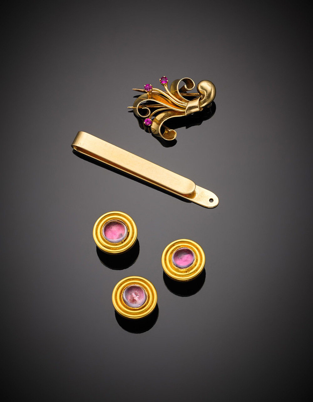 Lotto composto da una spilla, un fermacravatta e tre bottoni in oro giallo con gemme rosa, g.24,50 Yellow gold lot composed of a pin, a tieclip and three buttons with pink gems, in all g.24,50