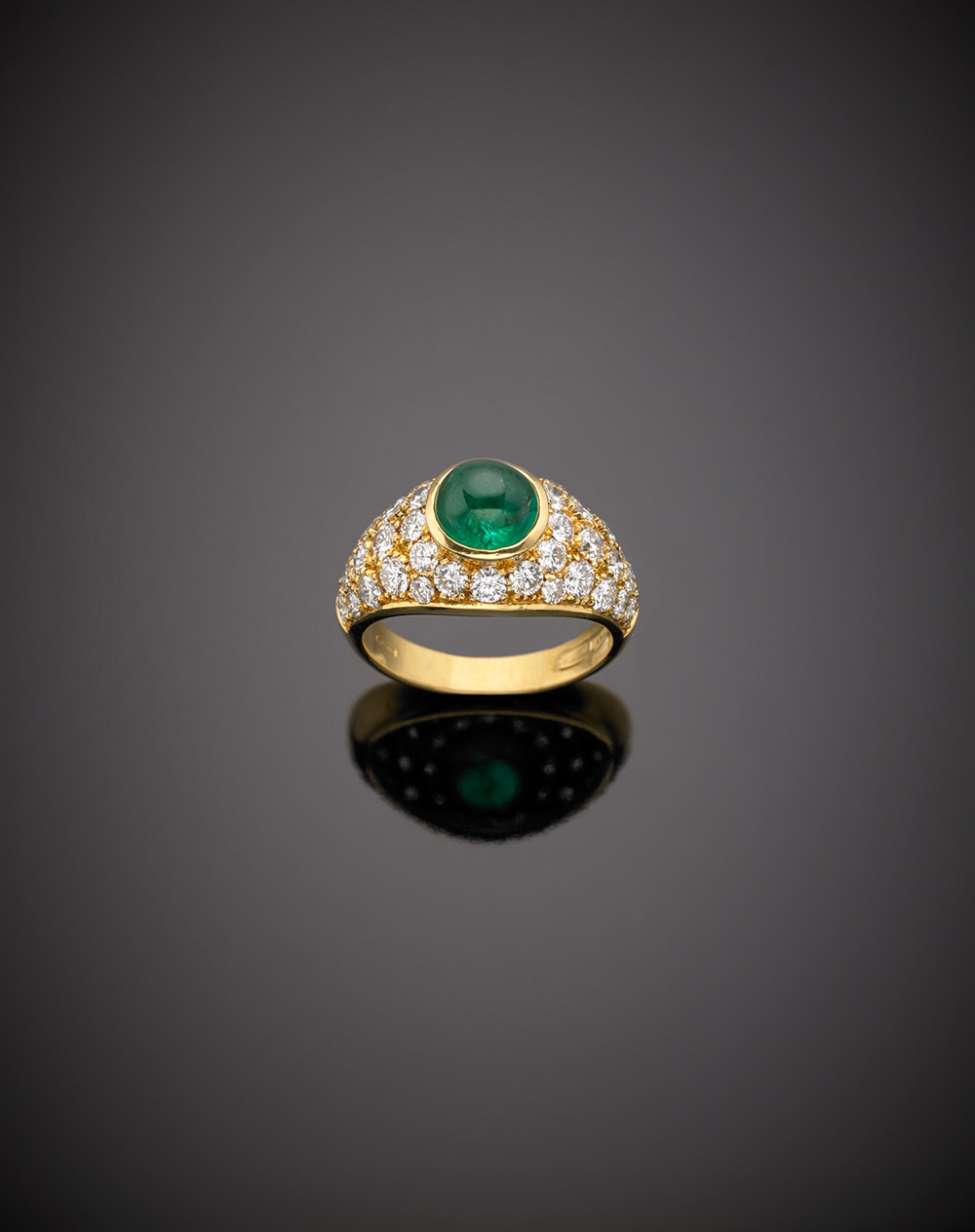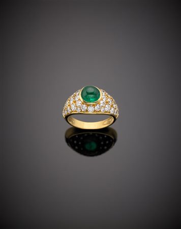 MISSIAGLIA Anello in oro giallo con diamanti e smeraldo cabochon di ct.1,40 circa, g. 6,0, misura 13/53 MISSIAGLIA Yellow gold ct.1,40 circa cabochon emerald ring accented with diamonds g. 6,0 size 13/53