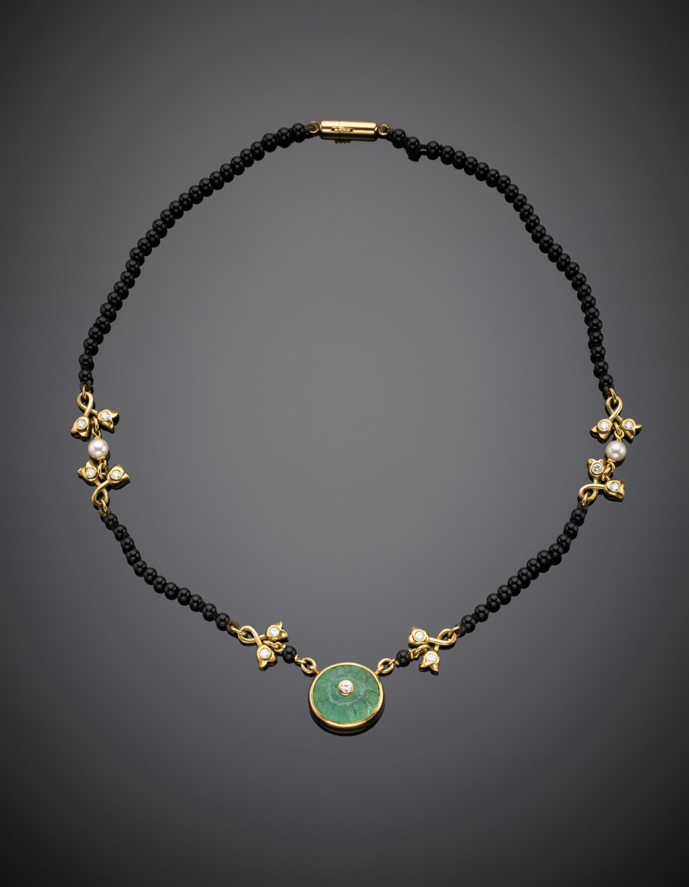 Collana in oro giallo con boules di onice, perle e diamanti ed al centro uno smeraldo cabochon ovale scolpito, g.17,60 lungh. cm 37,5 Yellow gold, pearl, diamond and onyx bead necklace with a central oval carved emerald, g.17,60 length cm 37,5
