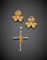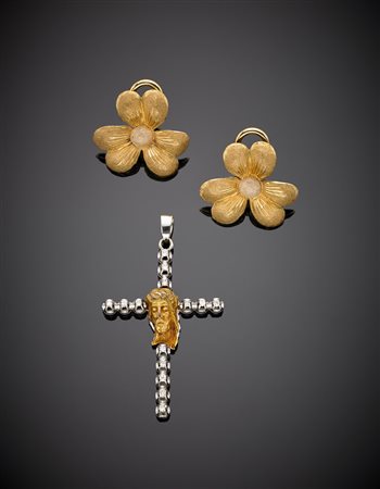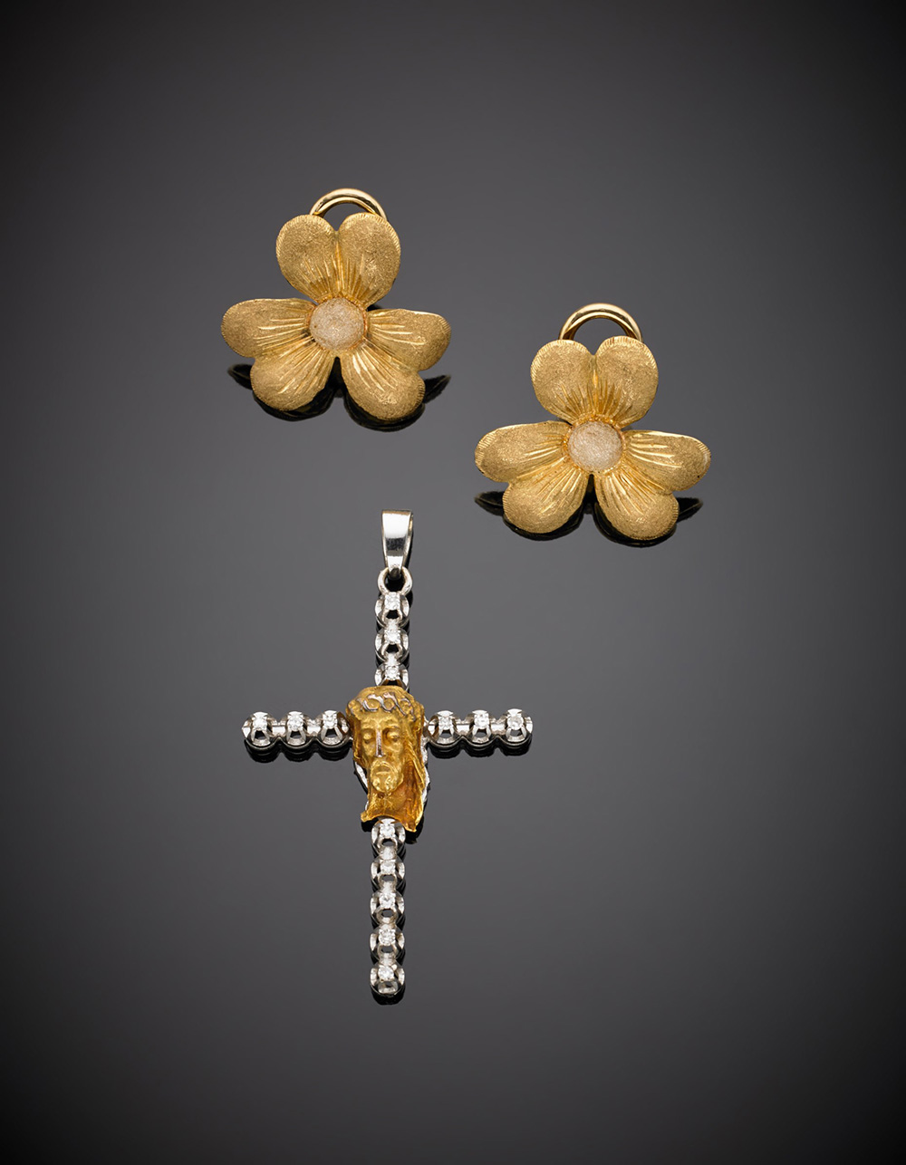 Lotto composto da orecchini a lobo con clip a guisa di fiore marcati FABBRINI e croce in oro bianco e giallo con pietre incolori g.15,50 Lot composed of yellow gold flower earclips marked FABBRINI and a bi-coloured gold cross with colourless gems, g.15,50