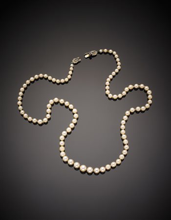 Collana in perle coltivate bianche a scalare con chiusura in oro bianco, zaffiri e diamanti g. 32 lungh. cm 70 circa White cultured pearl graduated necklace, white gold diamond and sapphire clasp, g. 32 length. cm 70 circa