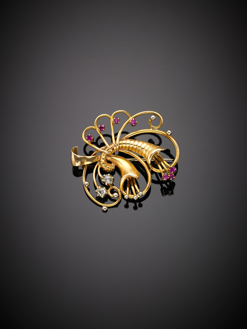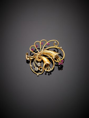 Spilla in oro giallo a guisa di cornucopie con due diamanti irregolari a mezza rosetta e due rubini rotondi, g.8,30 Yellow gold irregular diamond and ruby cornucopia brooch, g.8,30